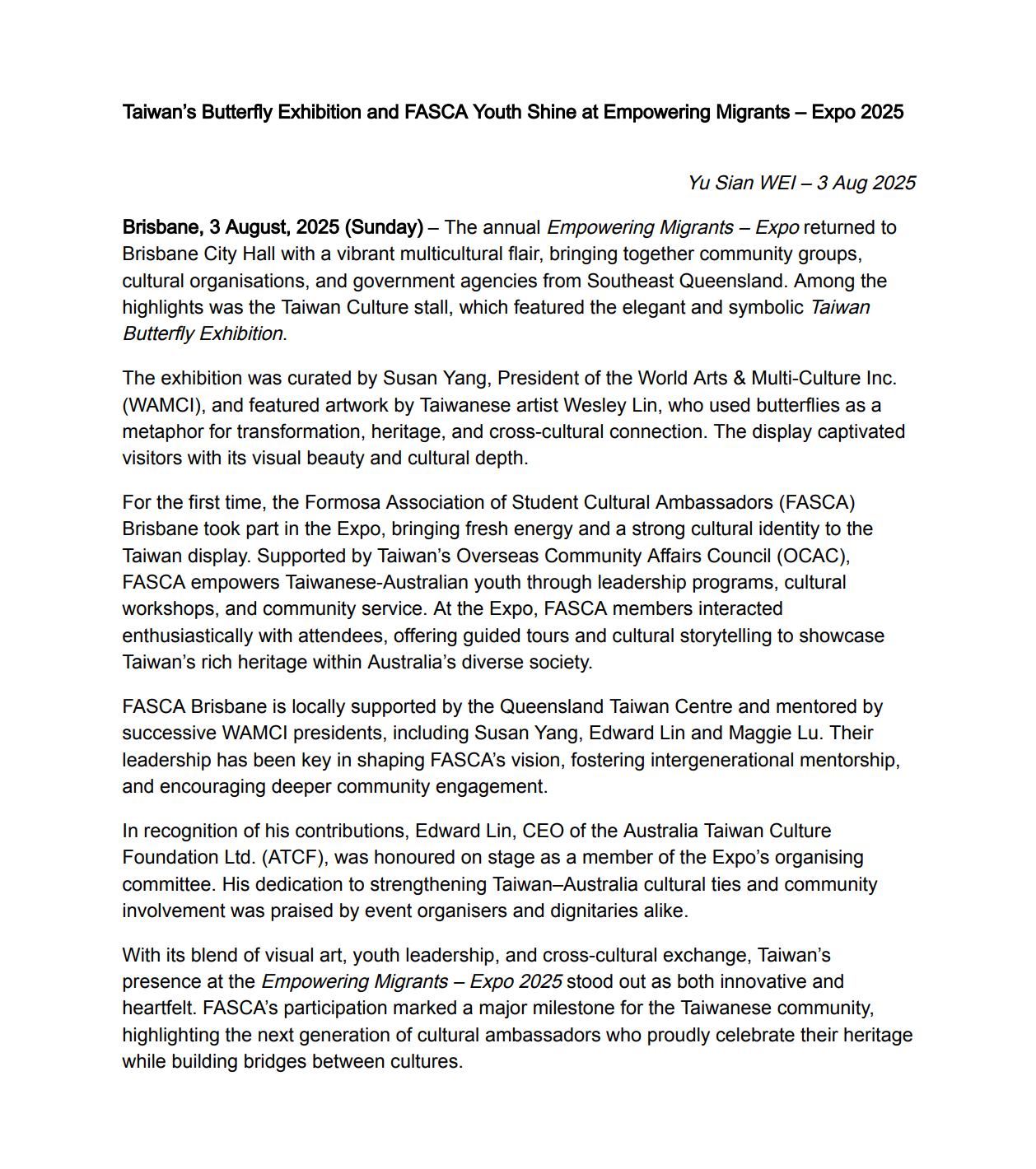 The annual Empowering Migrants – Expo returned to Brisbane City Hall with a vibrant multicultural flair, bringing together community groups, cultural organisations, and government agencies from Southeast Queensland. Among the highlights was the Taiwan Culture stall, which featured the elegant and symbolic Taiwan Butterfly Exhibition.
